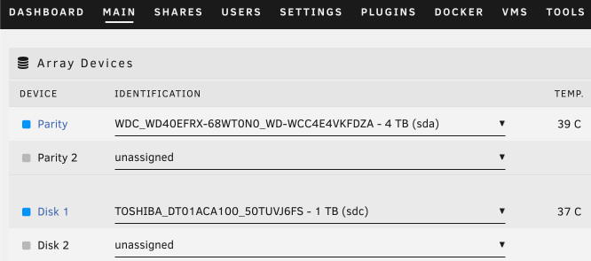 瀏覽MAIN > Array Devices,選擇最大容量的HDD作為Parity硬盤。注意分配作為Parity的硬盤容量是不可用的。Unraid的可用容量為Disk 1~n所有硬盤的容量疊加。