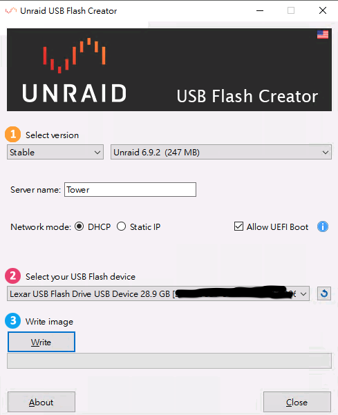 備註:一般建議選上“Allow UEFI Boot”。使用Unraid的主機較舊的話,則不勾選(因為舊主板不支持UEFI)。