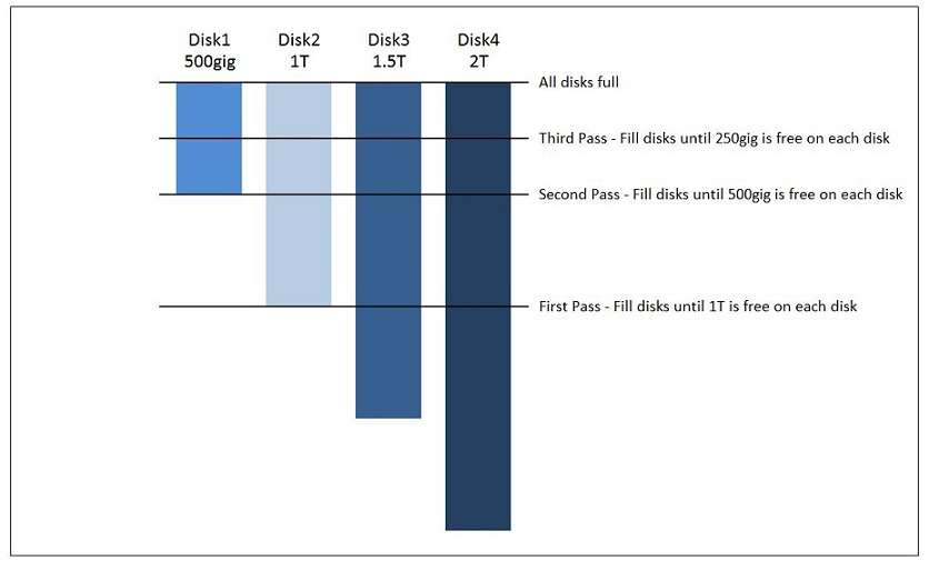 備註:以下截圖例子,High-water機制下會先將數據寫入Disk4和Disk3。當其剩餘容量為1T(Disk4容量的一半)時,會加入Disk2。數據會均勻地在Disk4、3、2之間寫入。當剩餘容量為500G時(1T容量的一半),會加入Disk1。