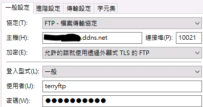 遠端FTP客戶端的登錄信息改成DDNS的Hostname以及外網的端口10021。