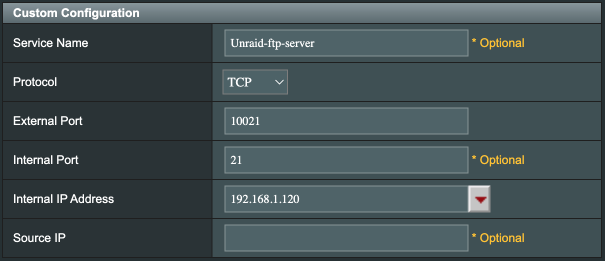 在路由器的NAT/Port Forwarding,建立一個端口映射規則。以下例子的意思是,內網IP為192.168.1.120及端口為21的數據包,映射到外網端口為10021的DDNS數據包 (即對IP數據包做以下映射:192.168.1.120:21 <-> xxx.ddns.net:10221)。在外網使用非默認端口可以避免防火墻Block以及一般的攻擊行為。