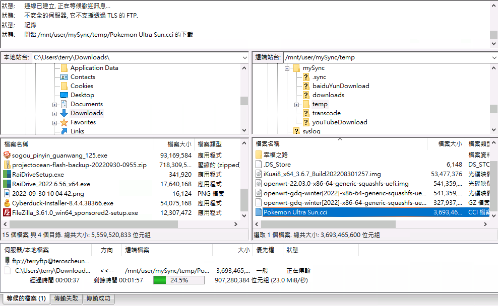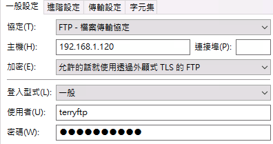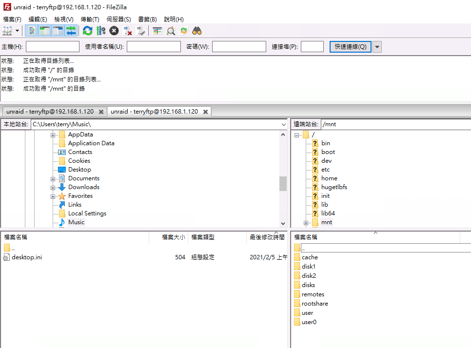 使用FTP Client測試。以FileZilla client為例,設定主機為Unraid的IP,端口為默認21。使用者和密碼為剛才新增的用戶信息。