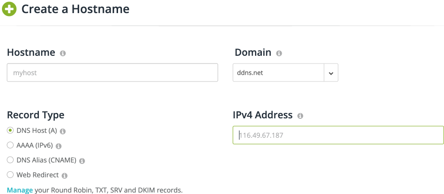 申請DDNS服務。註冊並登錄https://www.noip.com/,導航到My Account > Free Dynamic DNS Hostname > Create Hostname,按自己喜好輸入Hostname。IPv4 Address為你的Unraid的Public IP。