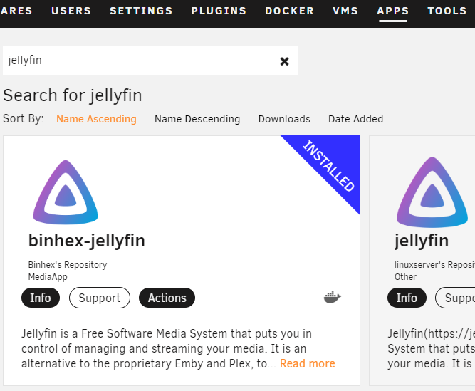 首先是從App市場下載Jellyfin。路徑是APPS > Jellyfin,搜索後,一般下載第一個即可。